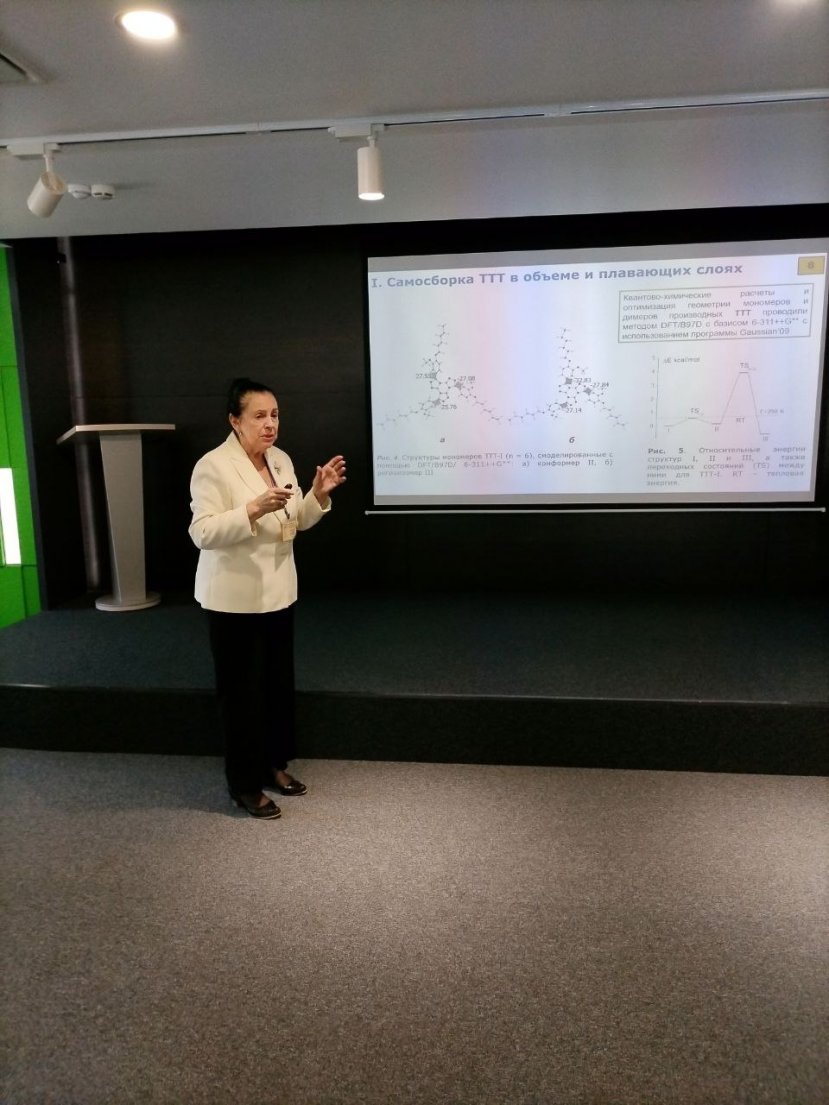 С устным докладом от коллектива авторов (Усольцева Н.В., Никитин К.С., Смирнова А.И., Акопова О.Б., Антина Л.А., Жарникова Н.В. и Бумбина Н.В.) «Надмолекулярная организация и фотофизические свойства звездообразных тристриазолотриазинов» выступила директор НИИН проф. Н.В. Усольцева.